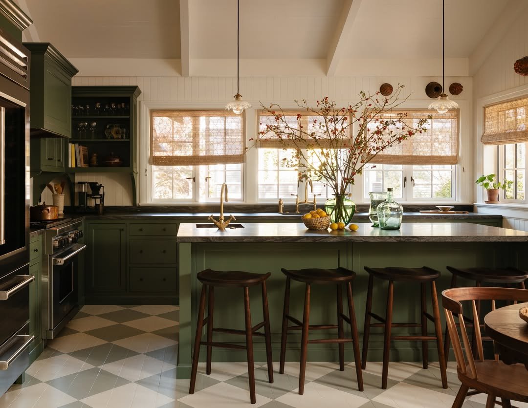 Deep green cabinetry paired with warm wood tones creates a richness that feels both classic and comforting. The checkered floor adds movement, while the styling keeps things relaxed.