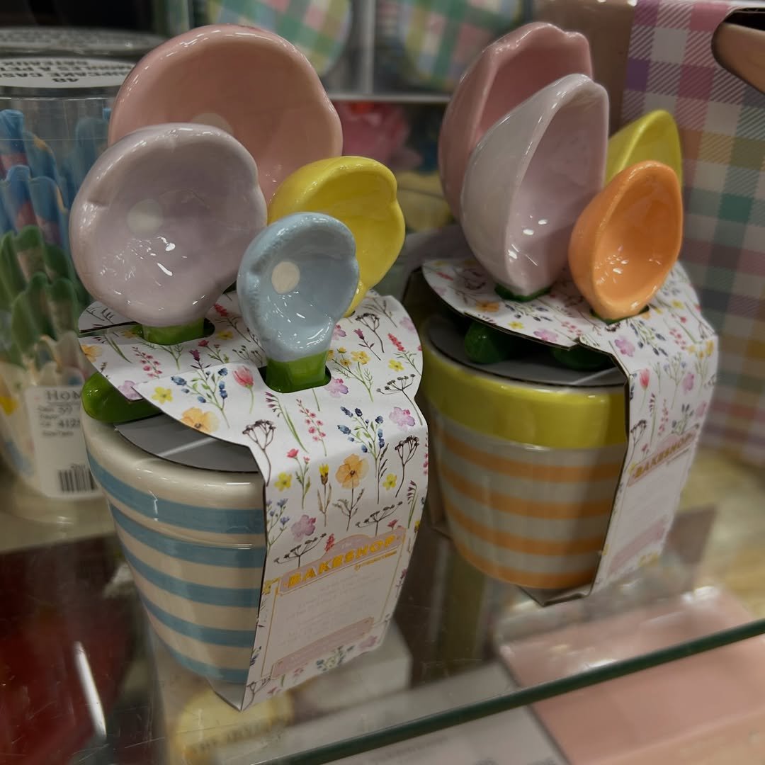 These little striped jars topped with pastel spoons feel like they belong at a sunlit garden party. Soft pinks, buttery yellows, and baby blues come together in a way that feels playful but still curated, like a sweet nod to nostalgia.