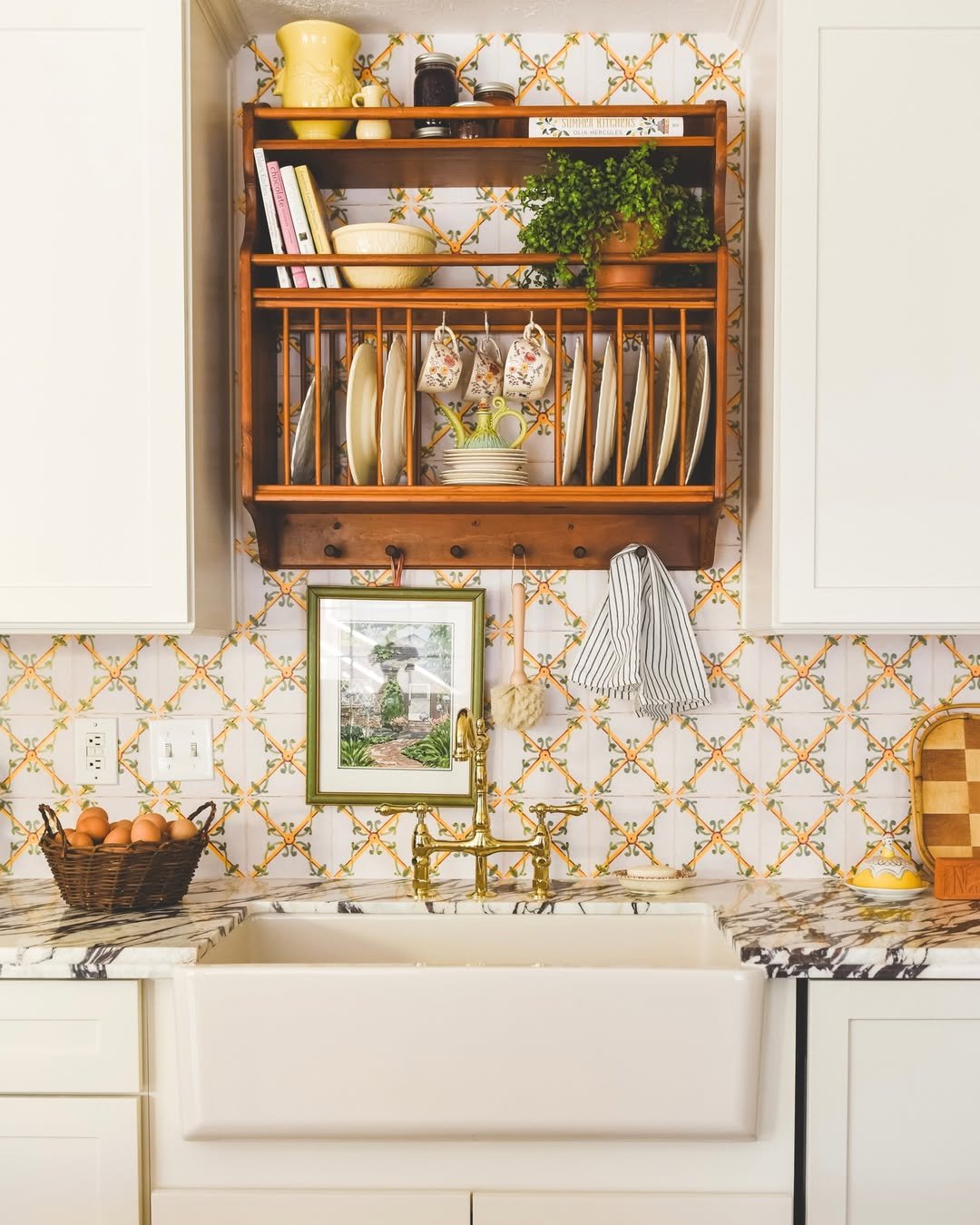The patterned tile behind the sink brings a gentle rhythm to the space, soft yellows and greens that feel fresh without overpowering. Paired with open shelving and warm wood, it creates a layered, lived-in look.