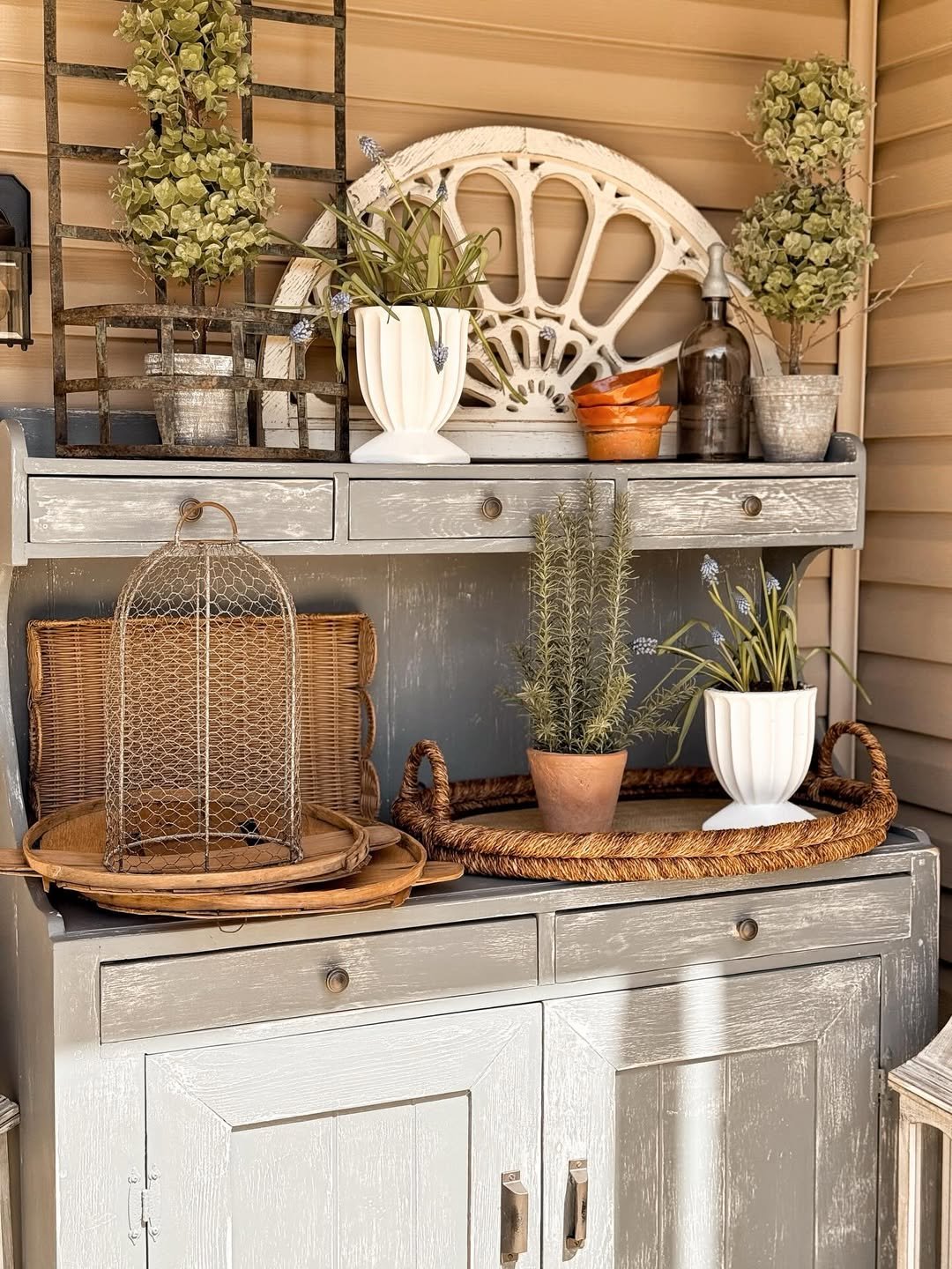 This setup feels like a quiet corner of a countryside kitchen, where everything has its place and a bit of history. Weathered wood, woven textures, and soft greenery come together in a way that feels grounded.