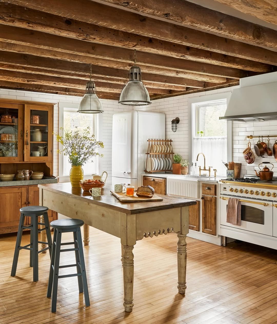 Exposed wood beams, white tile, and a vintage-style fridge create a space that feels rooted and warm. It’s the kind of kitchen where mornings start slow, with coffee and open windows.