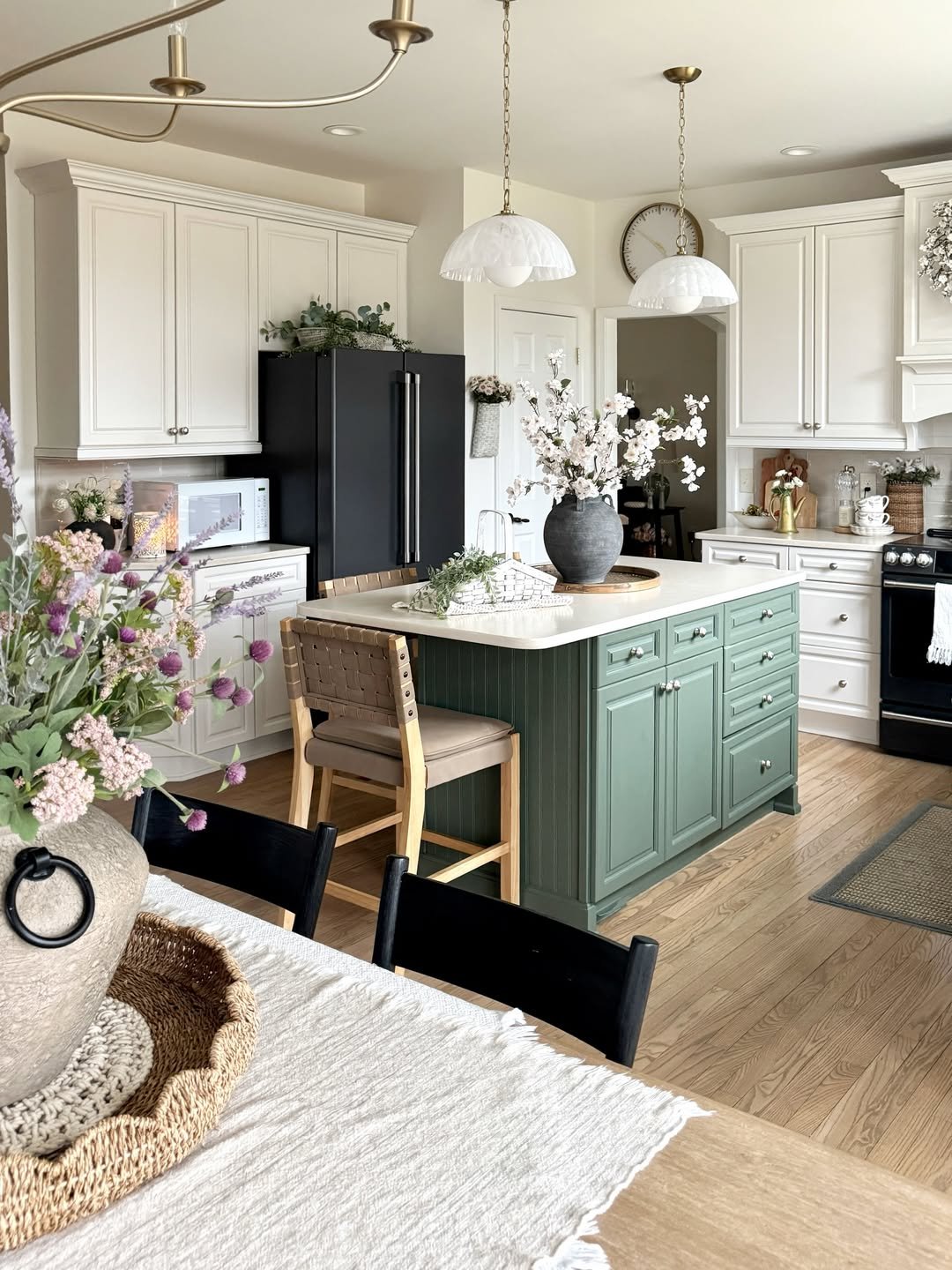 This kitchen feels like a breath of fresh air. The muted green island grounds the space while soft florals and woven textures add that light, seasonal layer that shifts everything toward summer.