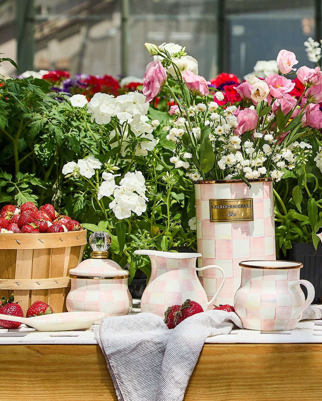 There’s a romantic charm here that feels straight out of a summer afternoon. Blush check ceramics paired with fresh strawberries and loose florals create a scene that feels abundant without being overwhelming.