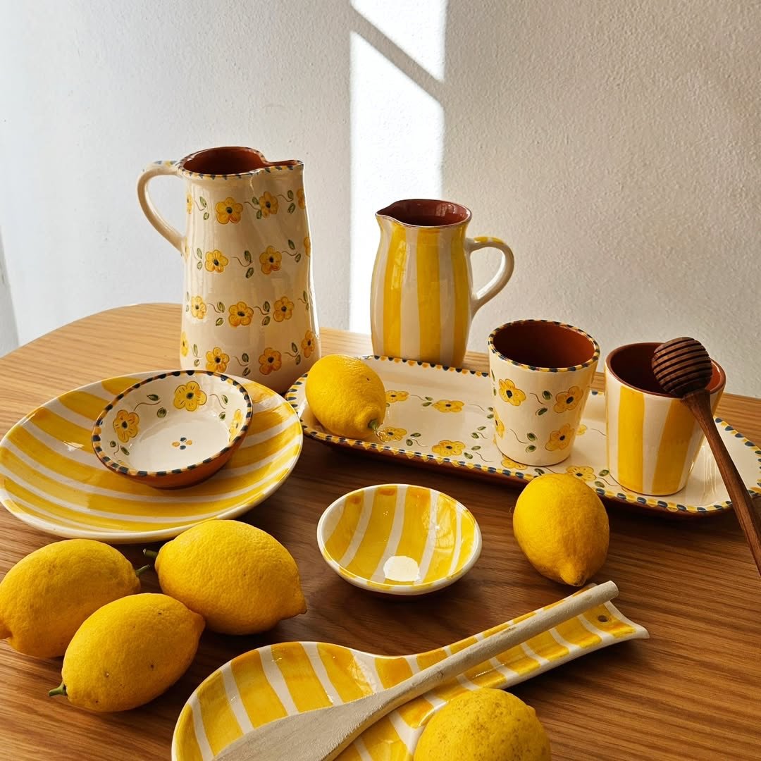 This setup feels like a page from a Mediterranean afternoon. Yellow stripes, hand-painted florals, and scattered lemons create a palette that feels bright without trying too hard.