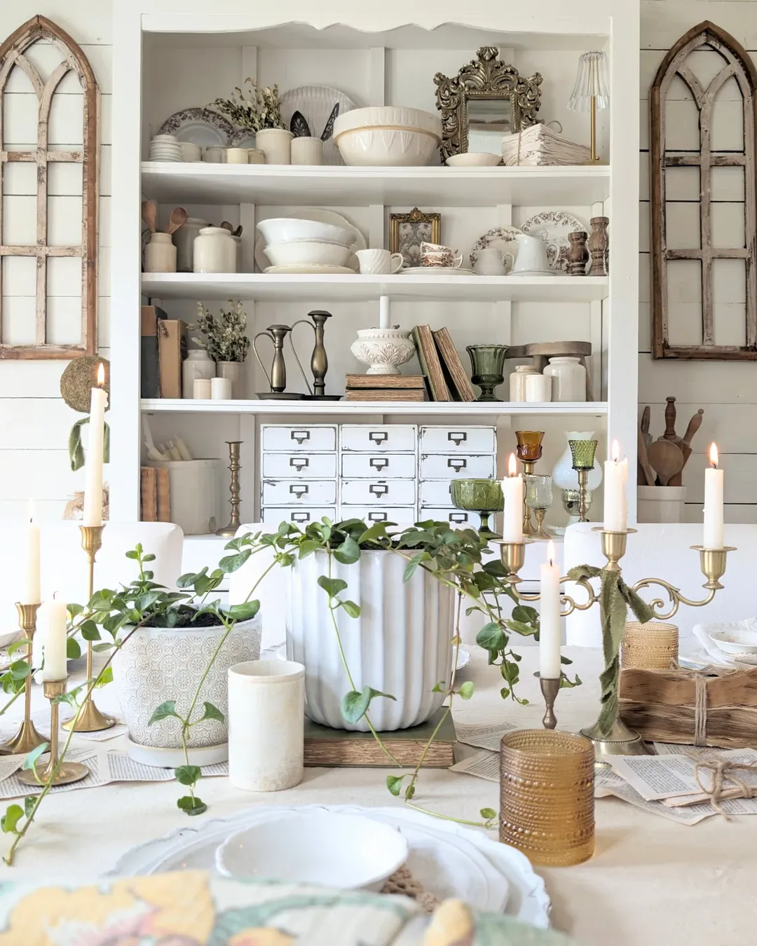 Soft whites, aged metals, and worn wood create a look that feels curated yet relaxed. The open shelving becomes a quiet showcase of collected pieces, each one adding depth without overwhelming the eye.
