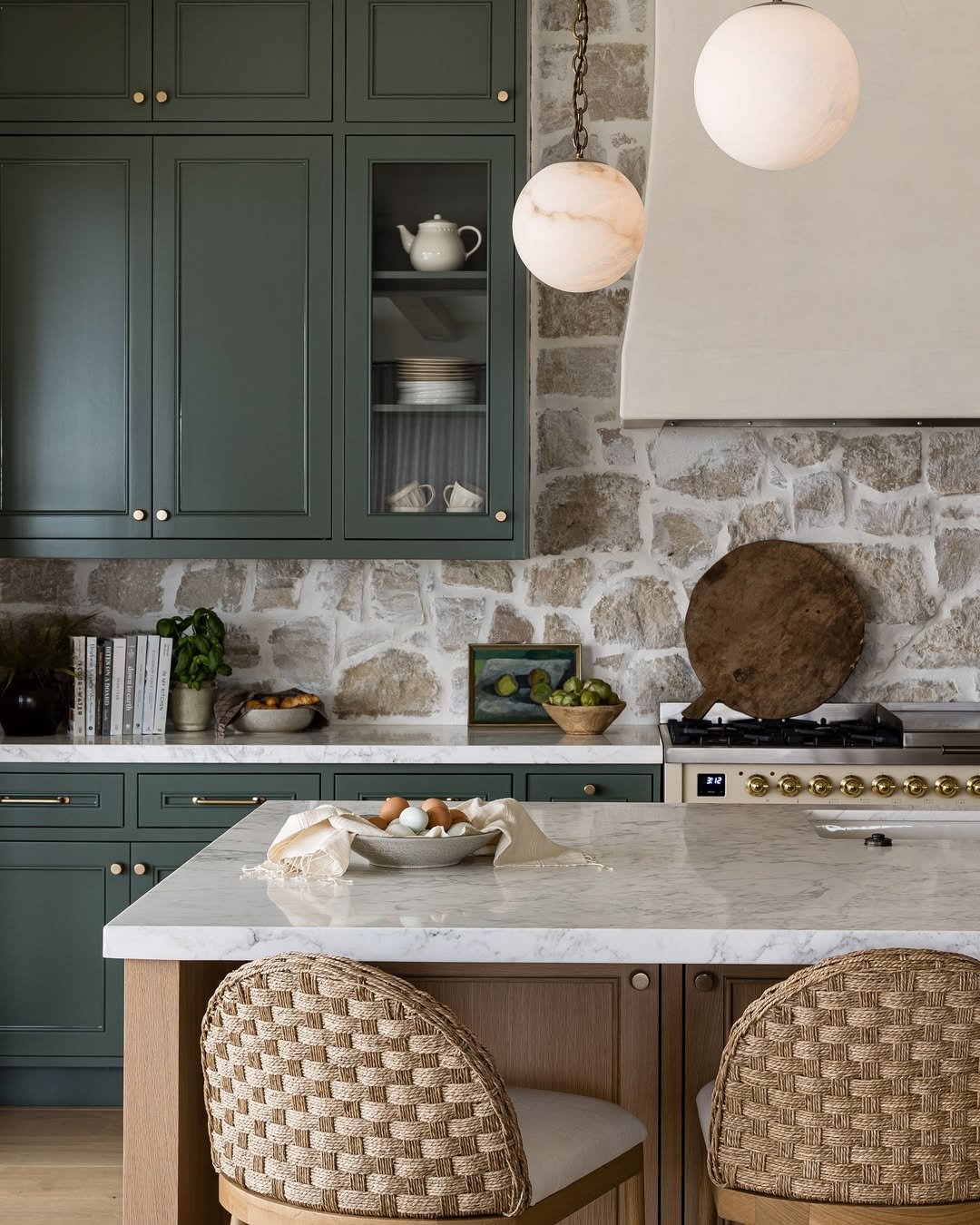 This space leans into texture in the most effortless way. The woven stools, soft marble, and muted green cabinetry create a palette that feels calm and grounded.