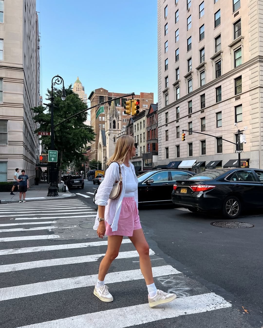 This outfit is your everyday done right. The crisp white shirt layered over a simple tee with those relaxed pink shorts feels light, fresh, and made for city strolls.