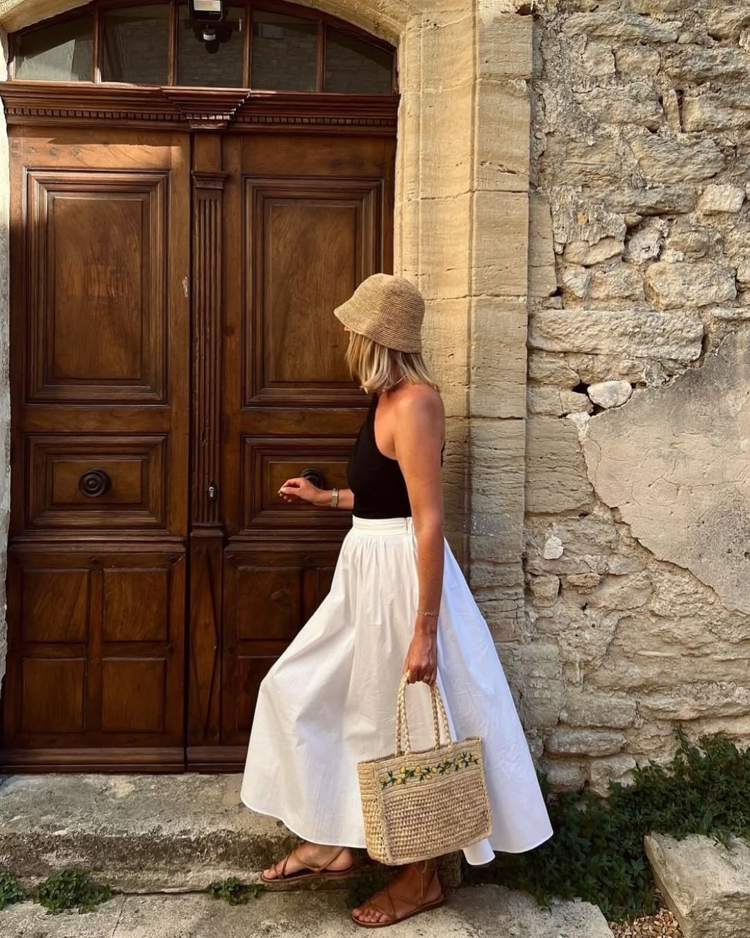 The straw bag and sandals soften the whole vibe, giving it that breezy, coastal feel. It’s timeless, a little romantic, and very “I didn’t try, but I nailed it.”