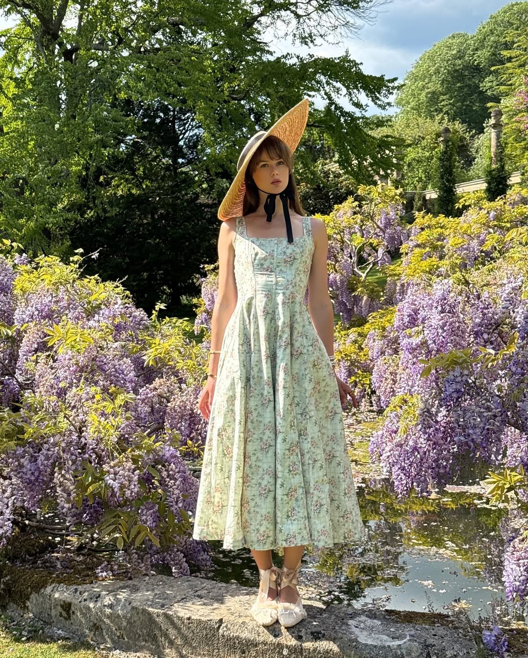 This look feels straight out of a dreamy summer afternoon. The soft floral midi dress paired with that wide-brim straw hat gives major cottagecore energy—but in the most wearable way. It’s feminine, flowy, and just effortlessly romantic.