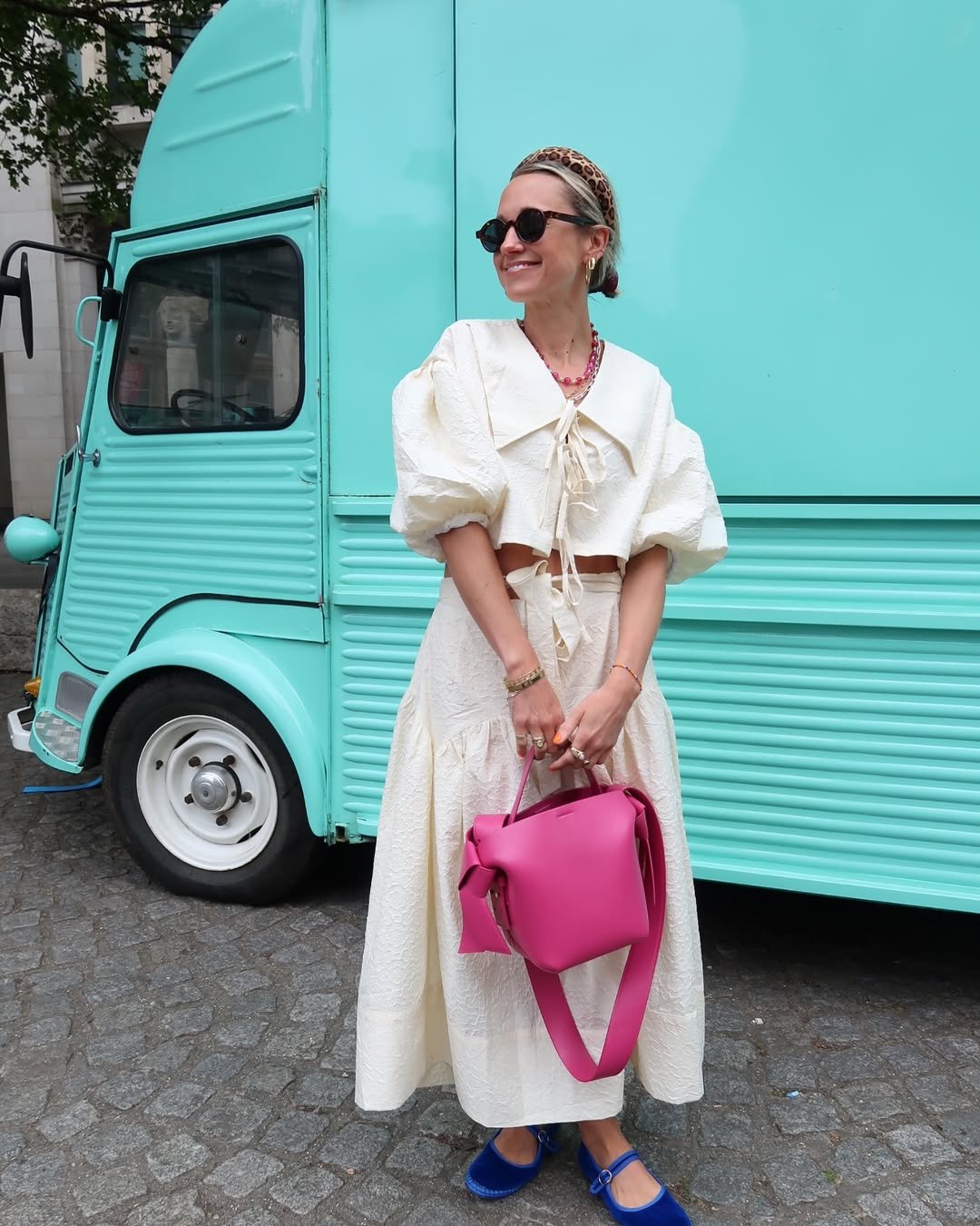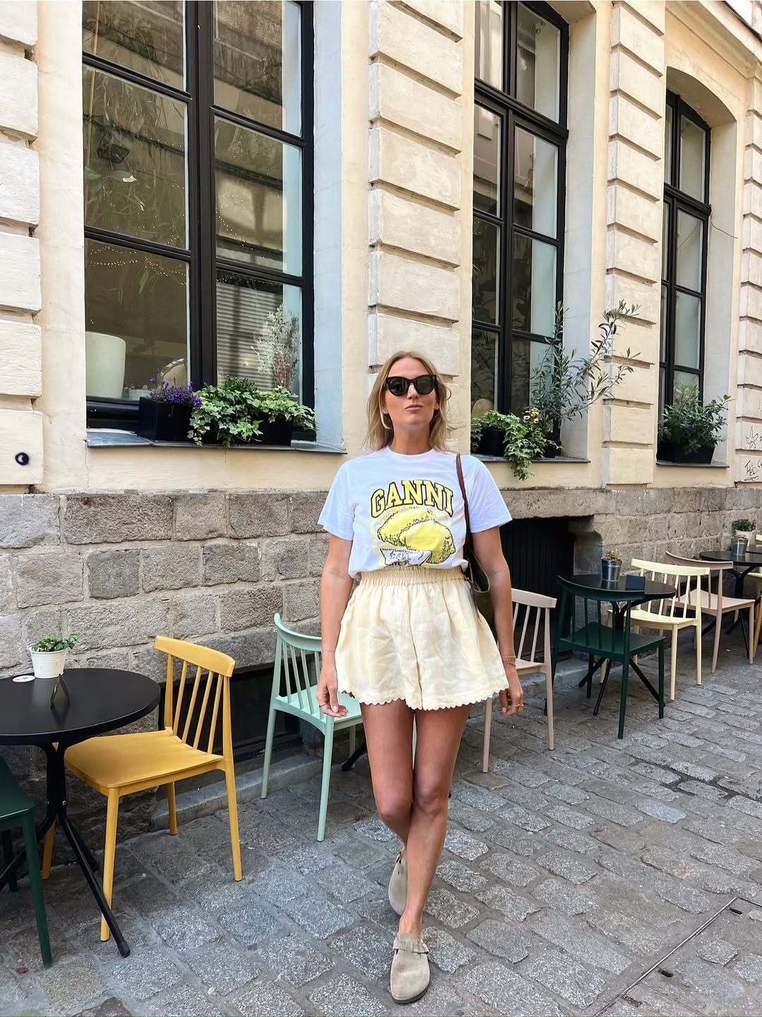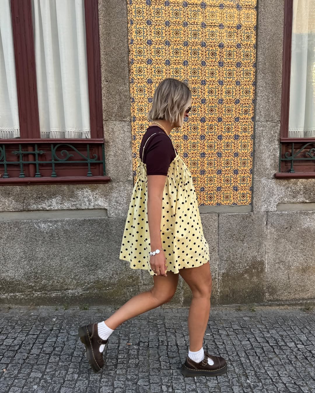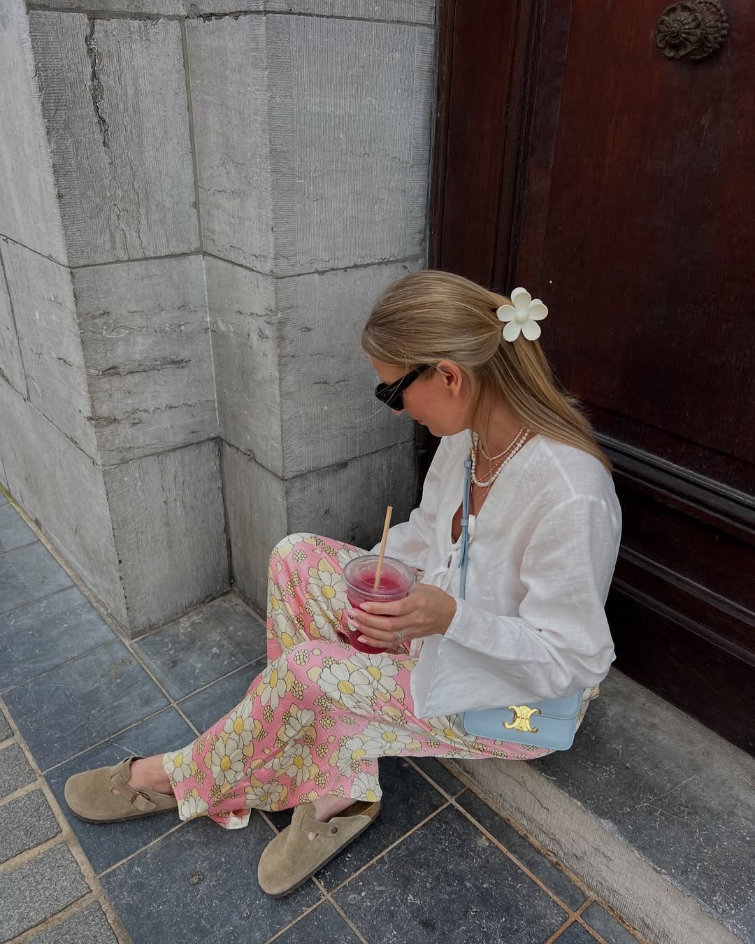 The chunky sandals and statement accessories add personality without overpowering the look. It’s relaxed, a little playful, and perfect for those sunny city strolls.