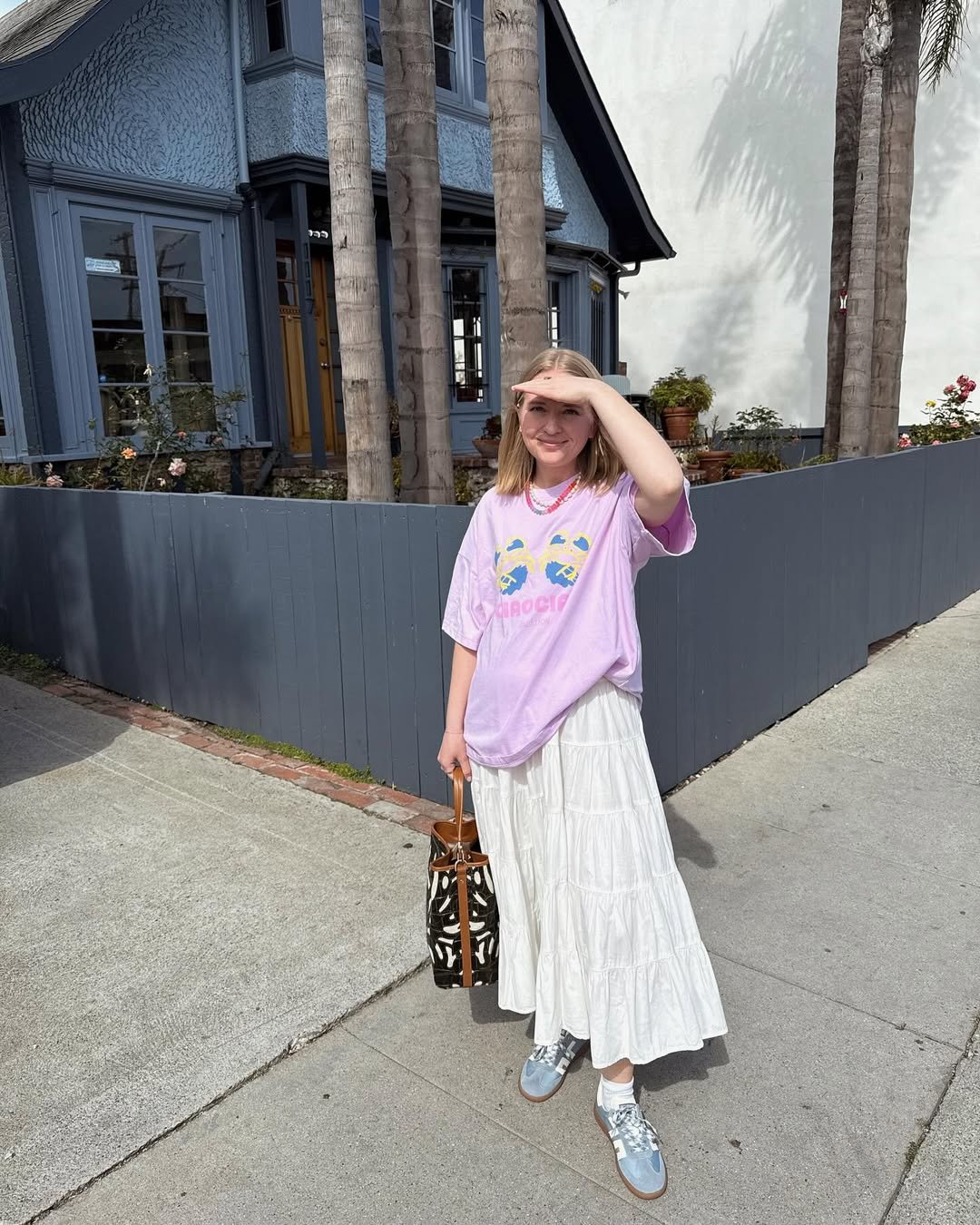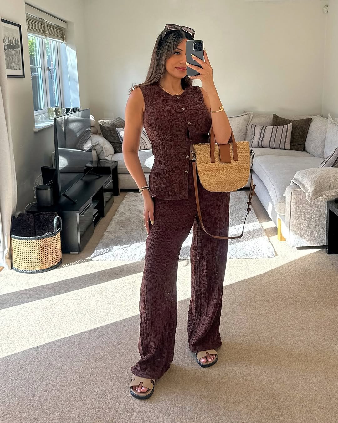 The brown sandals and matching tote keep everything cohesive. It’s that perfect mix of effortless and styled—like you just know what you’re doing.