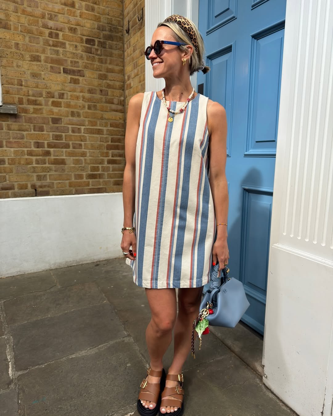 This outfit is summer in its most carefree form. The sleeveless striped mini dress brings that easy, throw-on-and-go energy, but still feels polished and styled.