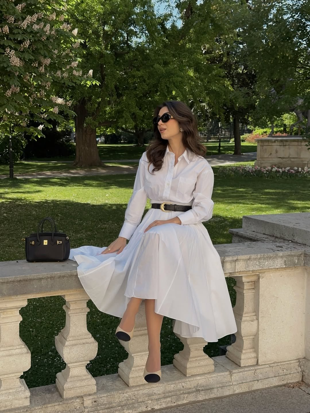 This outfit is pure sophistication. The crisp white shirt dress cinched at the waist creates a silhouette that’s both classic and incredibly flattering.