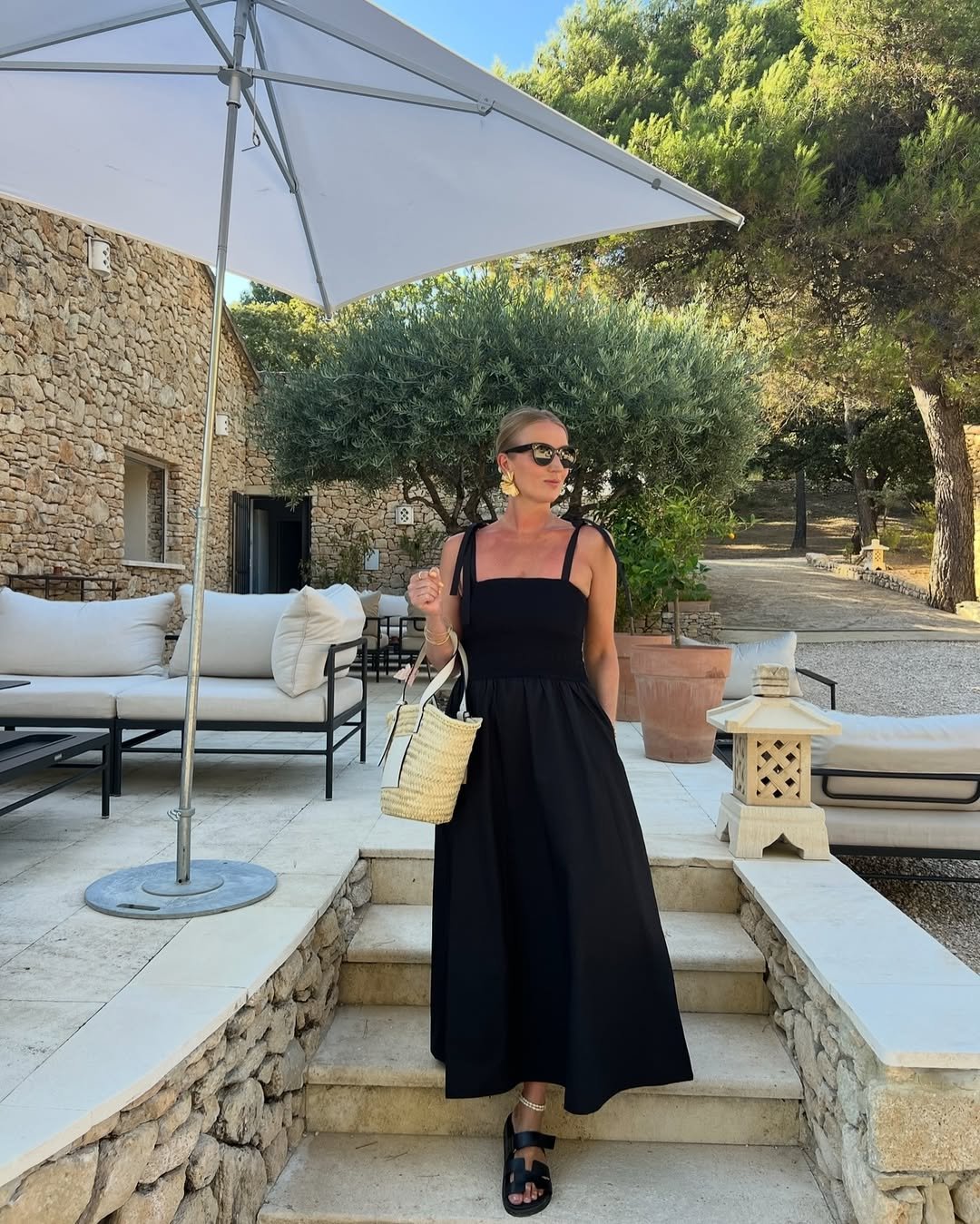 Styled with a straw bag and bold earrings, it feels elevated but still relaxed. It’s the kind of outfit you pack knowing you’ll wear it more than once.