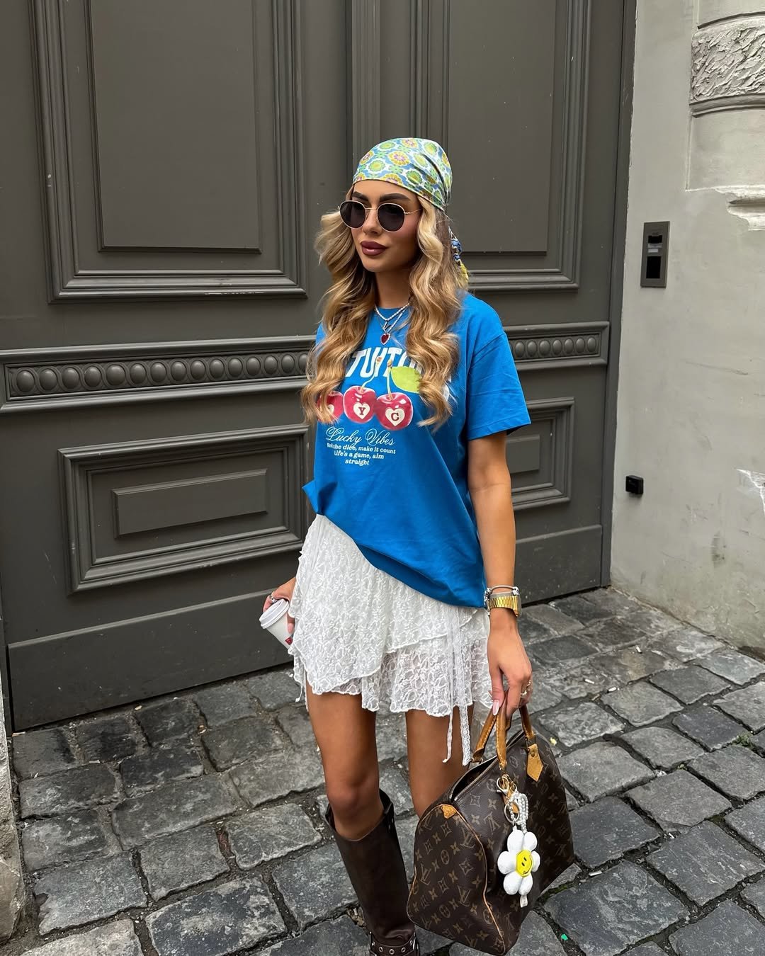 The headscarf, sunglasses, and boots add personality and edge, turning a simple outfit into something memorable. It’s fun, a little nostalgic, and very cool-girl coded.