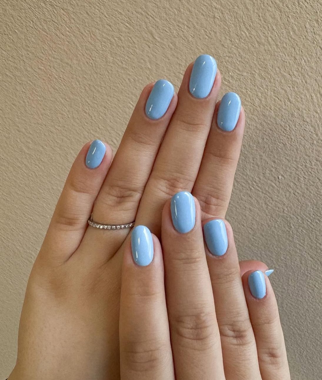 Sometimes one perfect color is all you need. This glossy baby blue manicure is clean, crisp, and effortlessly pretty on short round nails.