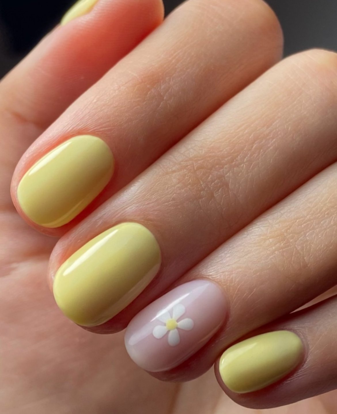 This soft yellow manicure adds a subtle floral twist that feels sweet but still minimal. The buttery base color keeps things smooth and elegant, while the tiny white daisy accent adds a touch of personality.