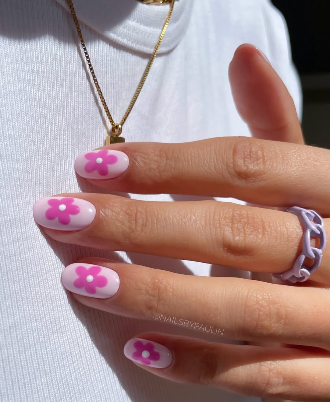 These nails feel like the cutest little burst of summer. The soft baby-pink base keeps everything light and glossy, while the bold pink daisy flowers instantly steal the spotlight. It’s playful, bright, and just the right amount of retro.