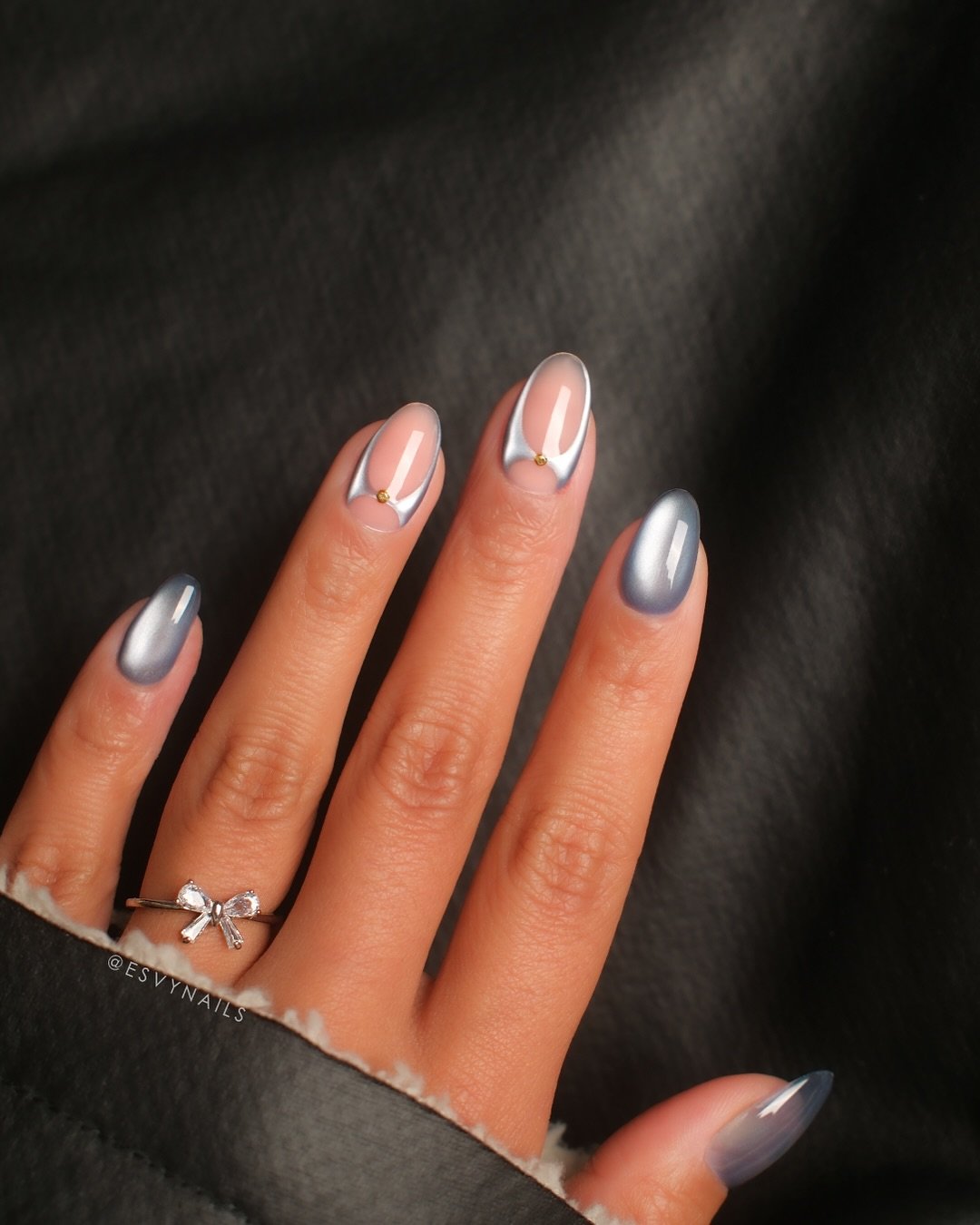 Chrome nails always bring drama, and this design balances it beautifully. The soft nude base keeps things classy while the metallic silver accents add that futuristic shine that catches the light from every angle.