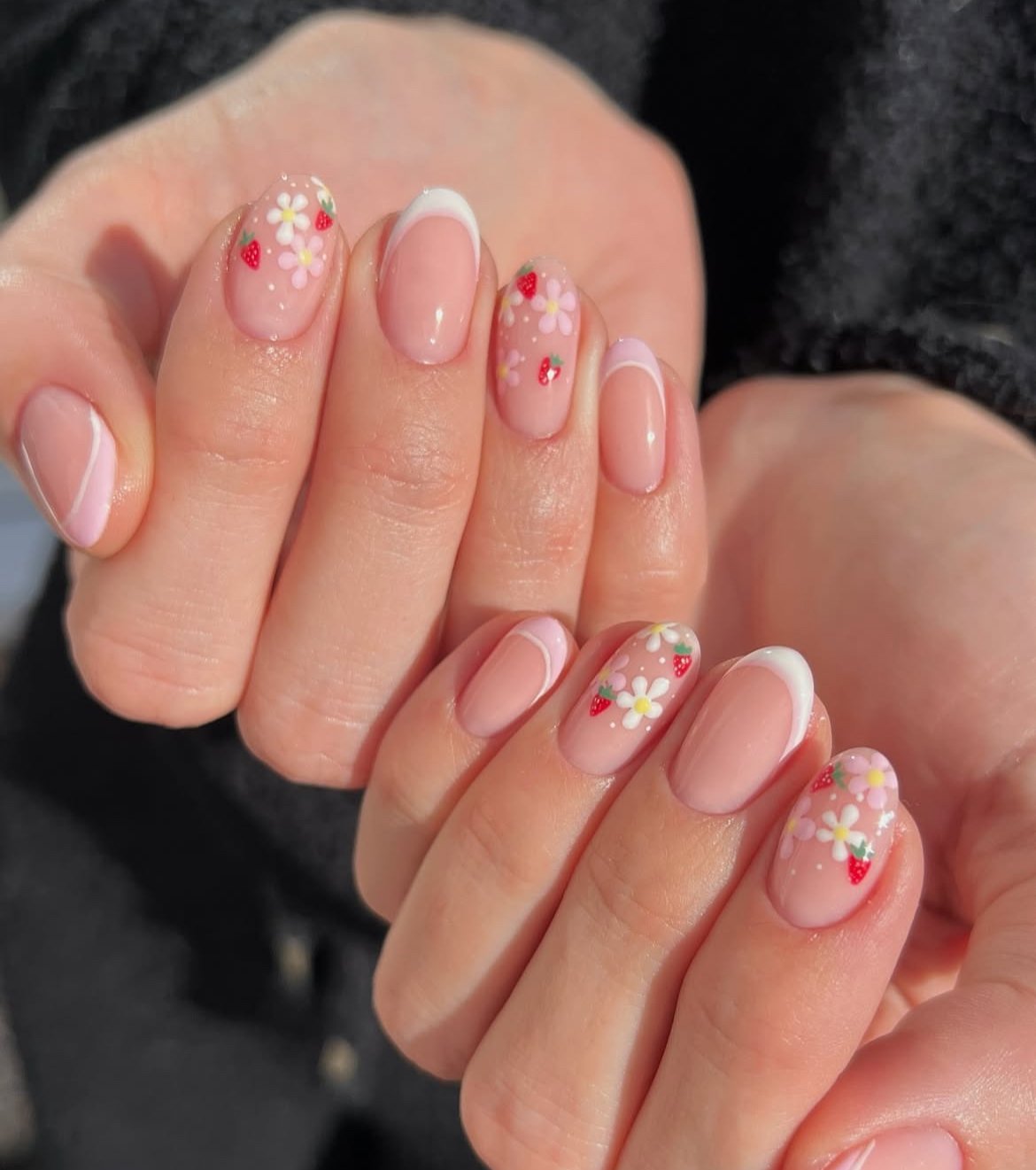 This manicure feels like summer in the cutest way possible. Soft nude nails paired with delicate white French tips create a fresh base, while tiny strawberries and daisy flowers add a playful garden-inspired twist.