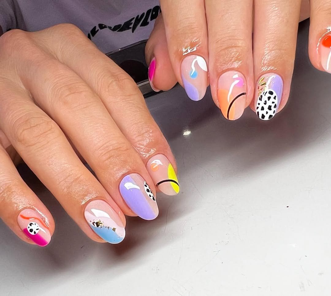 This colorful abstract manicure brings pure creative energy. Soft pastels, bold pops of color, and playful patterns combine to create a fun, artistic design that feels lively and unique.