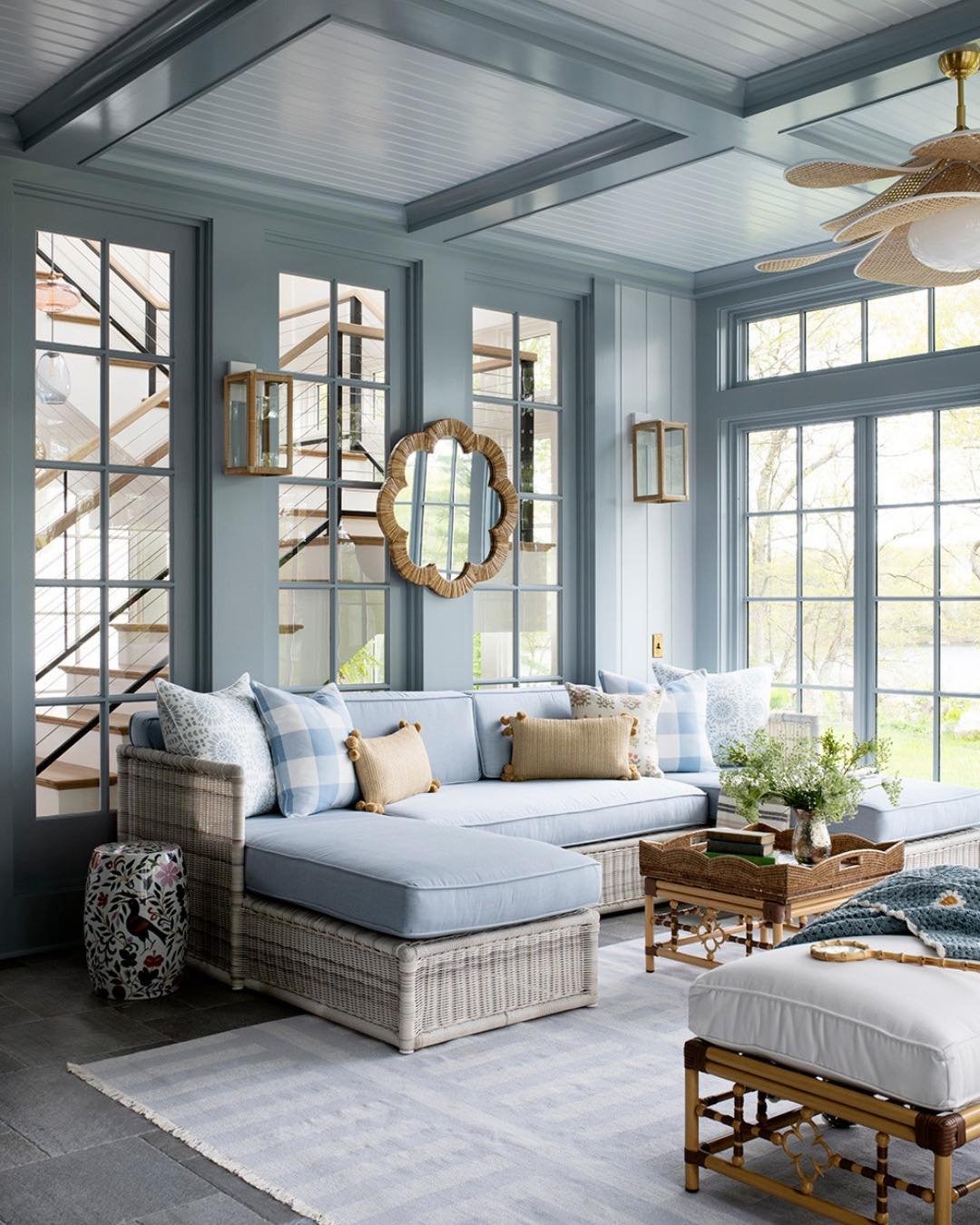 This space feels like a breath of fresh air pulled straight from the coast. Powdery blue walls wrap the room in calm, while wicker seating and soft cushions invite you to sink in and stay awhile. The symmetry of the windows frames the outdoors like artwork, shifting with the light.