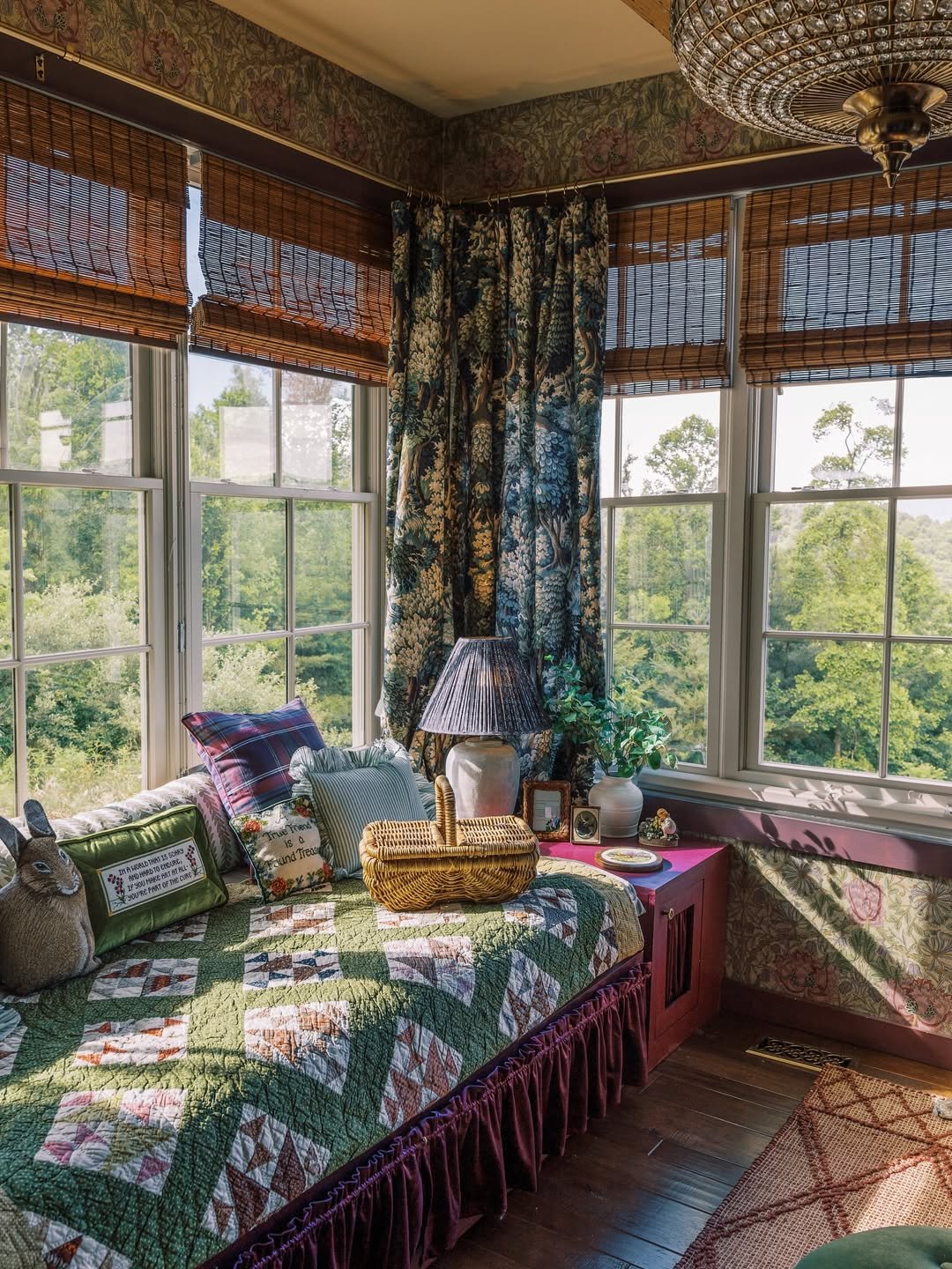 Patterns and textures come together here in a way that feels collected and full of personality. The layered fabrics and vintage-inspired details create a cozy corner that feels rich without being overwhelming.