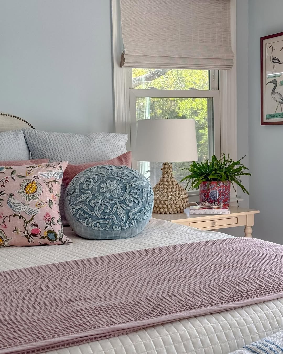 This space leans into softness with a layered mix of pale blues, blush tones, and gentle patterns that feel collected over time. The pillows alone tell a story, embroidered, textured, and perfectly imperfect. It’s cozy in that effortless, lived-in way that never feels overdone.