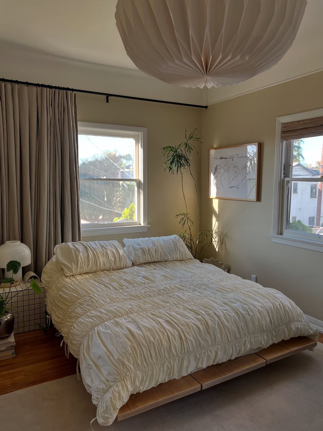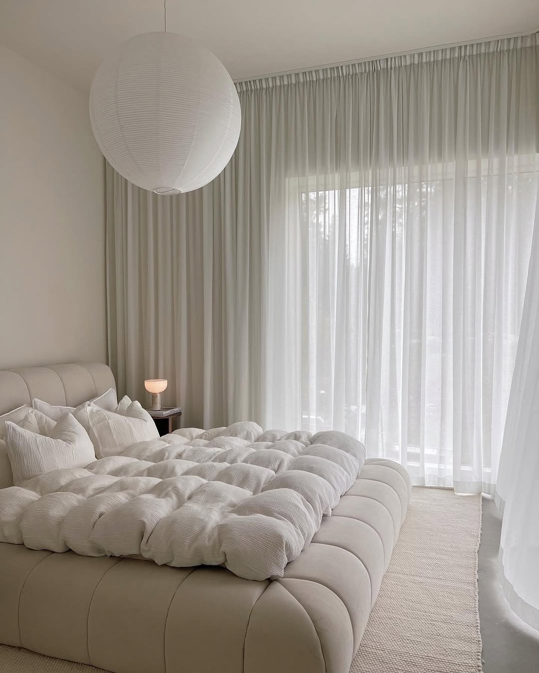 Sunlight spills gently across this low bed, wrapped in crinkled white layers that feel almost cloud-like. The palette stays warm and grounded, with beige walls, soft drapery, and a paper lantern overhead that diffuses the glow into something calm and quiet. It feels like a slow morning kind of space.
