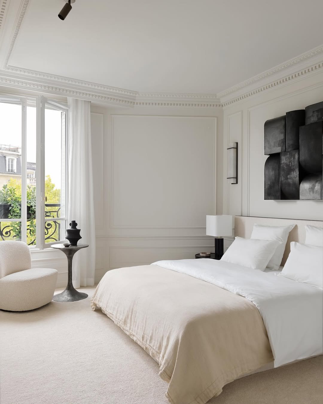 Soft white tones and delicate detailing give this room a Parisian feel that’s both minimal and refined. The light filters in gently, highlighting the clean lines and subtle textures across the bedding and walls.