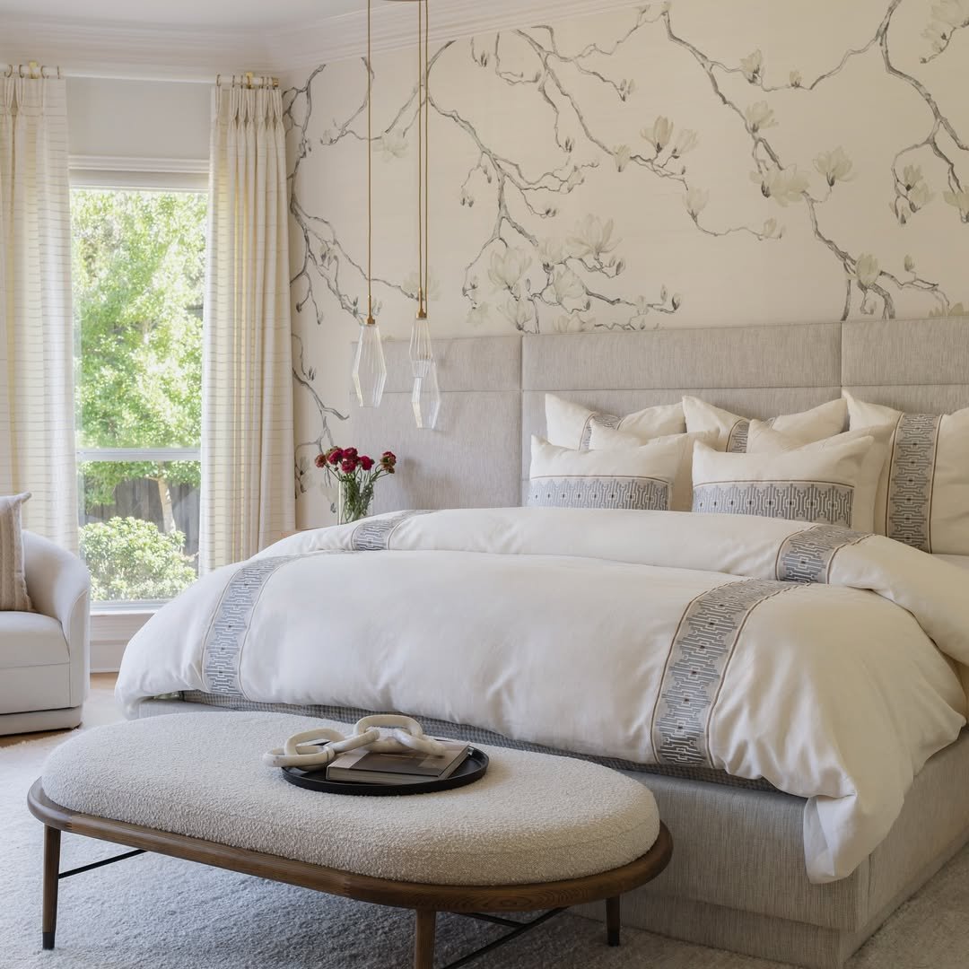 This room feels like a breath of fresh air, with its soft floral wall detail stretching behind a perfectly dressed bed. The palette stays within creamy whites and gentle greys, letting the subtle pattern add interest without overwhelming the space. It’s quiet luxury at its finest.