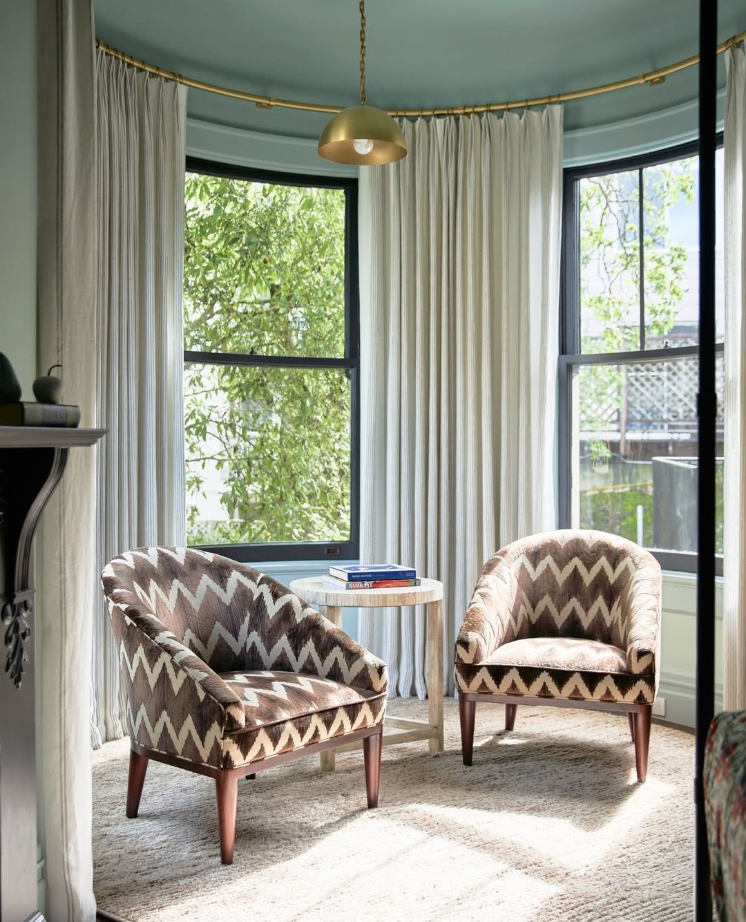 This little corner feels like it belongs to a quiet afternoon with a book. The curved windows pull in light from every angle, softened by linen drapery that pools just slightly at the floor. Those patterned chairs bring movement, a subtle zigzag that keeps the neutral palette from feeling flat.