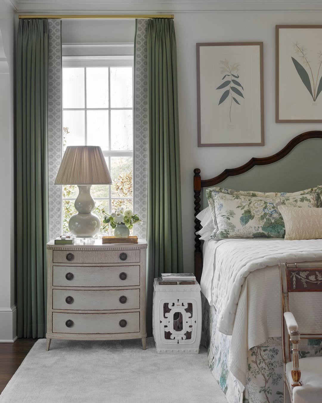 Gentle green tones bring a sense of calm to this space, paired with soft fabrics and classic detailing. The layered bedding adds depth without disrupting the overall simplicity.