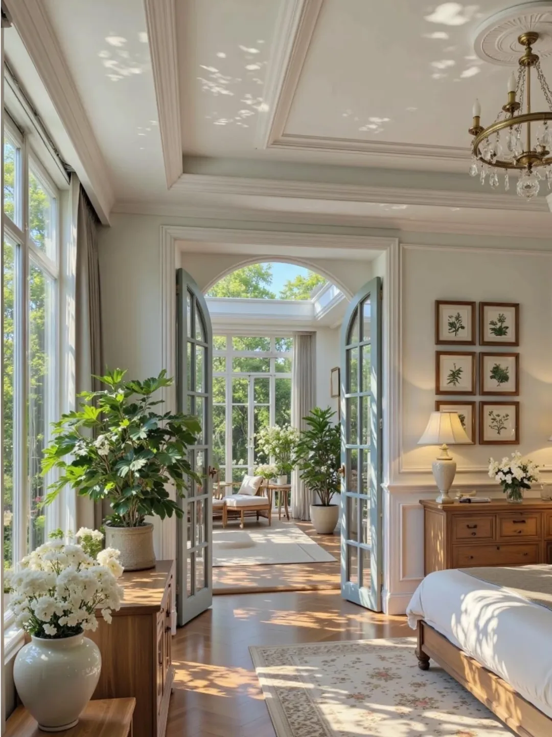 Light pours through those open doors, drawing you toward the greenery beyond and turning the bedroom into part of the outdoors. The soft palette of whites and natural wood keeps everything feeling fresh and grounded at the same time.