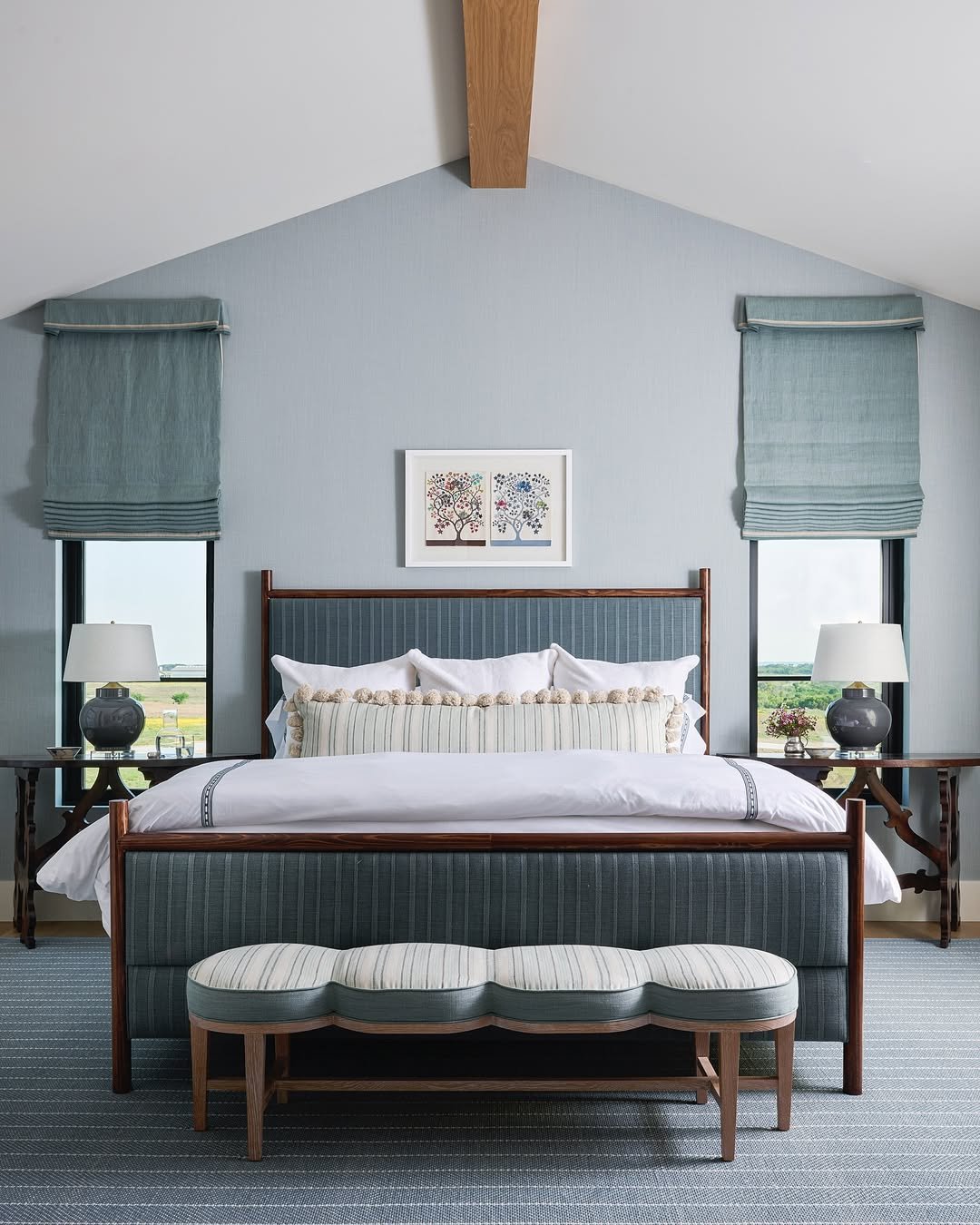 This room brings in a tailored feel with structured lines and soft blue tones that echo the outside view. The symmetry of the windows and matching shades creates a sense of calm order, while the upholstered bed keeps things comfortable and inviting.