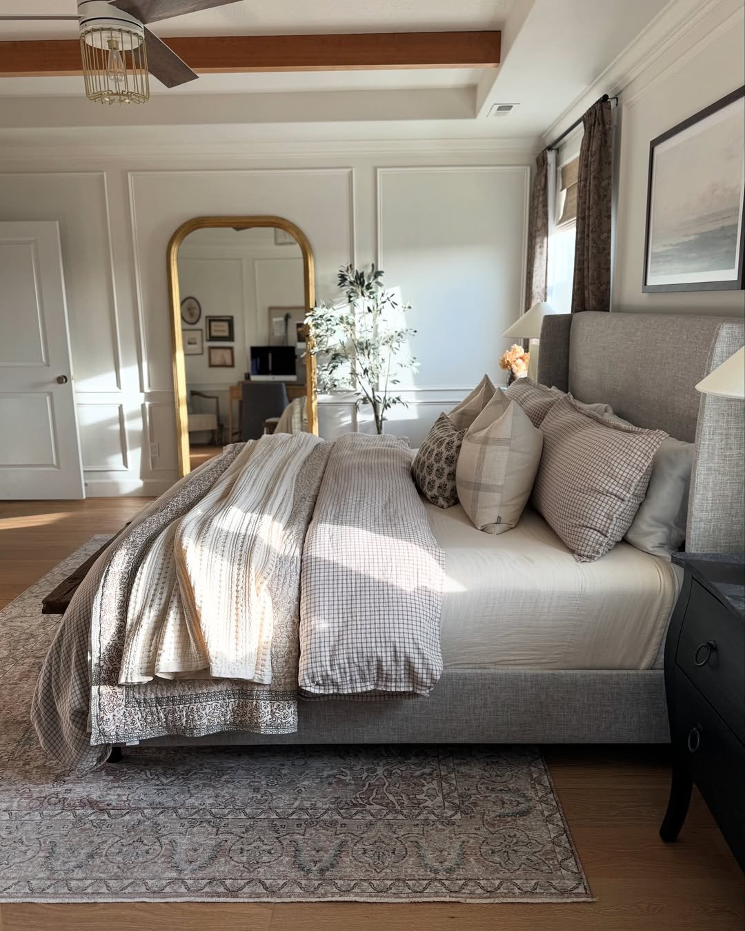 There’s a relaxed elegance here, with each piece contributing without competing. The mirror and natural wood elements bring depth, while the bedding invites you in. It feels like a space that evolves with you over time.