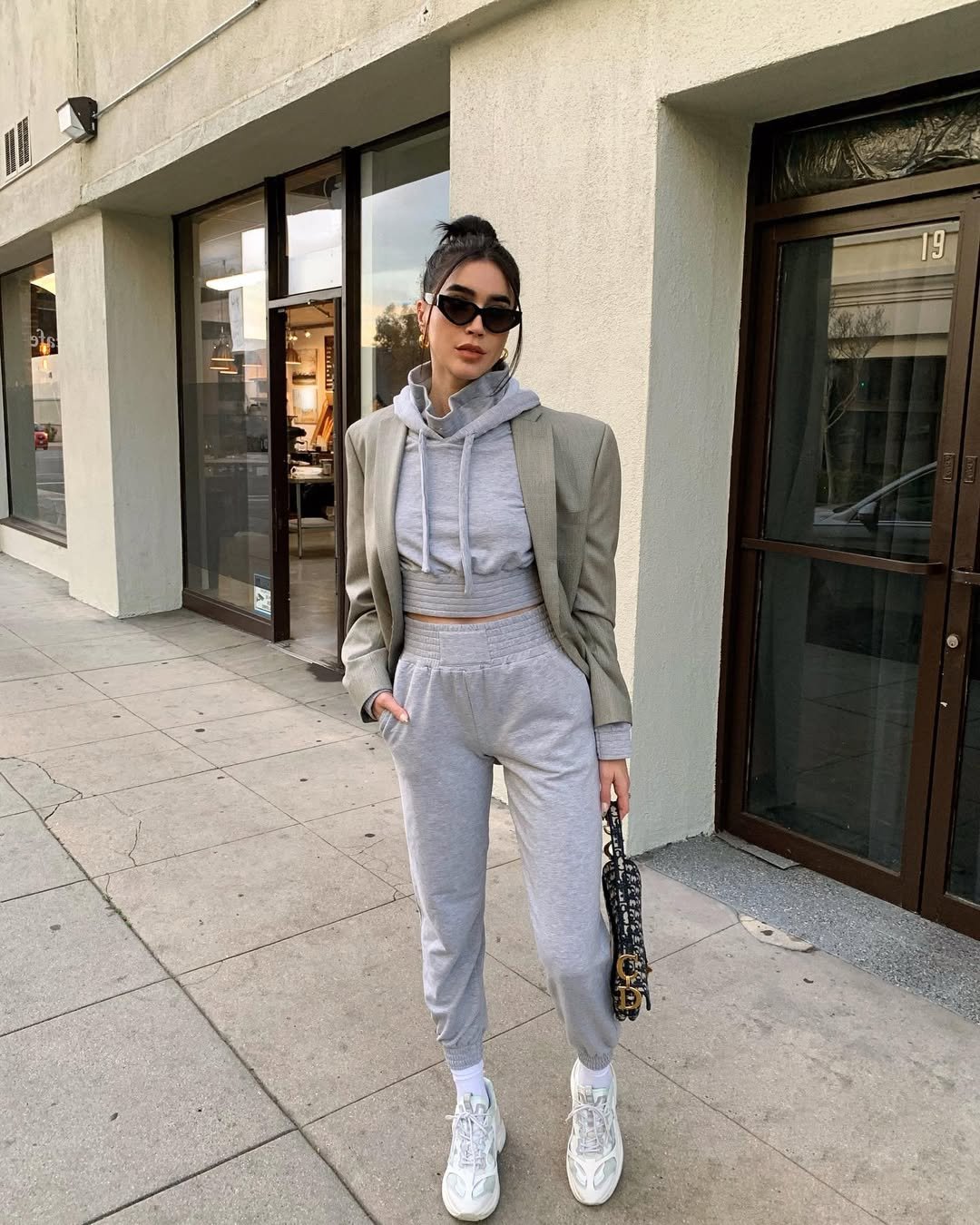 Here is the ultimate reminder that sweatpants can step into the polished lane. A structured blazer layered over a cropped hoodie gives the whole outfit a fashion-forward twist that feels equal parts relaxed and refined.