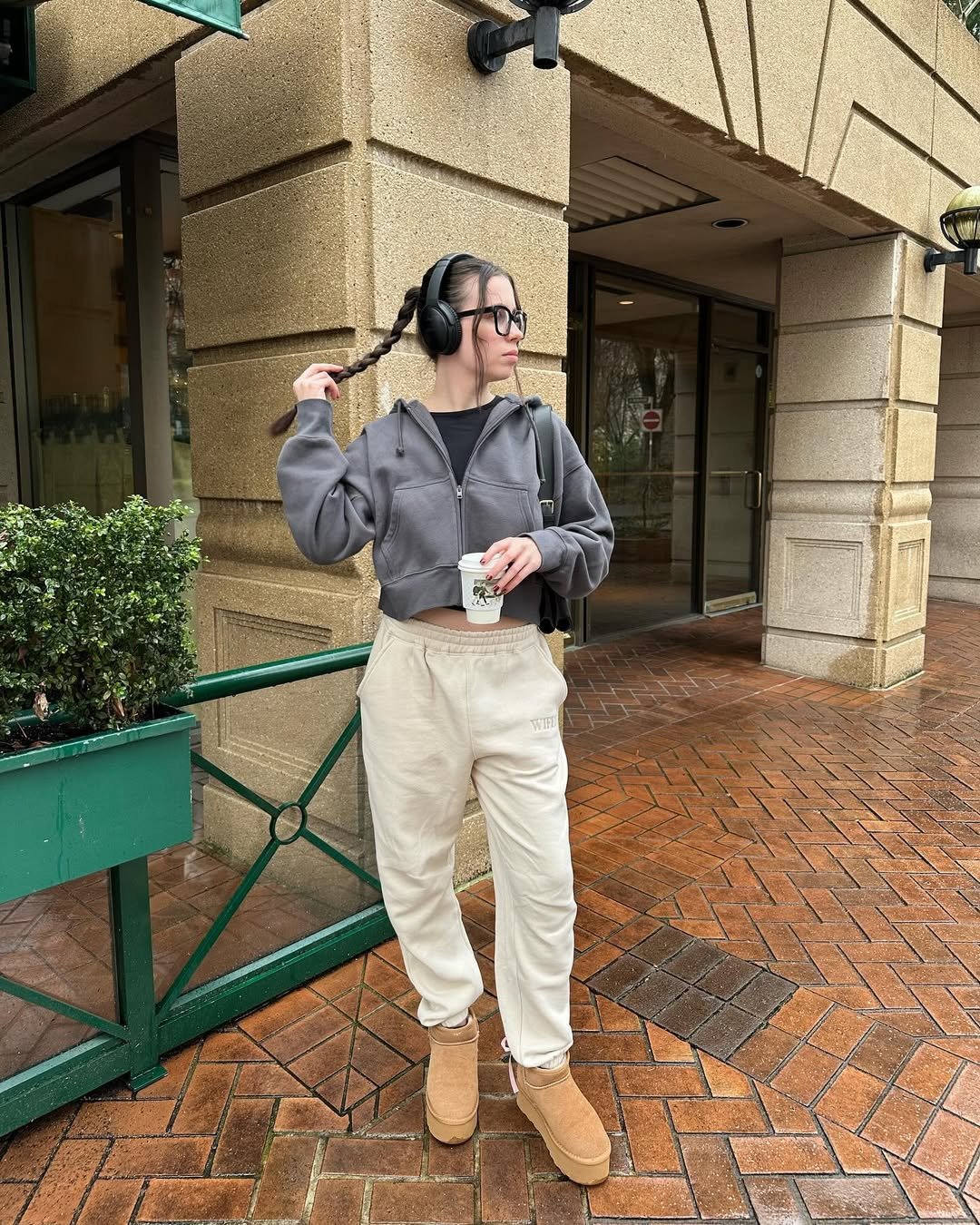 This outfit feels like the perfect mix of cozy and cool. The neutral sweatpants paired with that cropped hoodie give the look a relaxed silhouette, while the chunky headphones and glasses bring a little personality into the mix.
