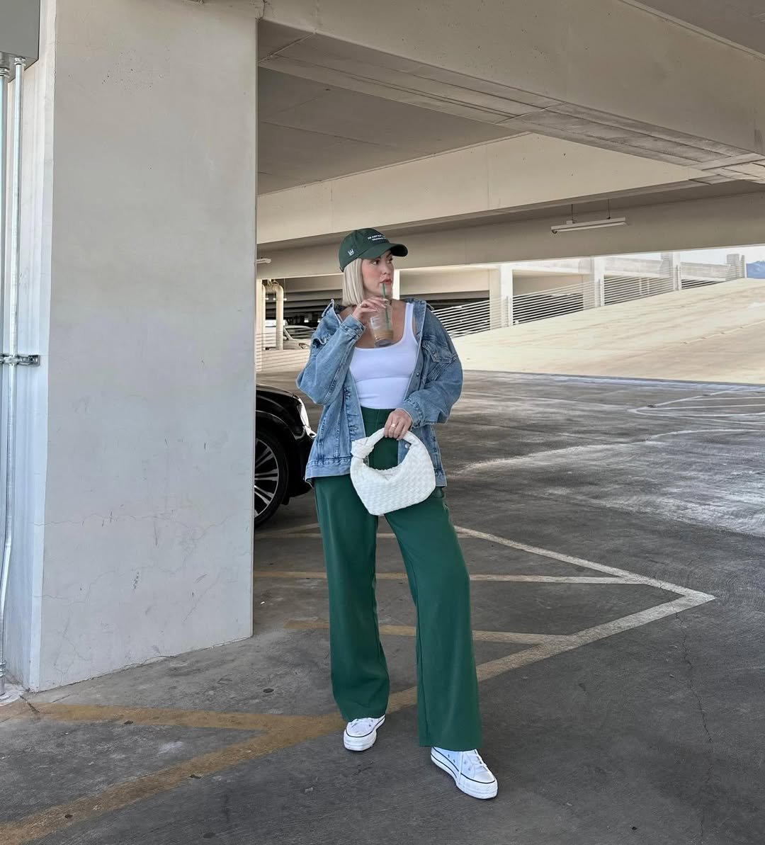 This look feels like the ultimate off-duty cool. The relaxed green pants paired with a simple white tank and oversized denim jacket create that easy “I just threw this on” energy that somehow always works.