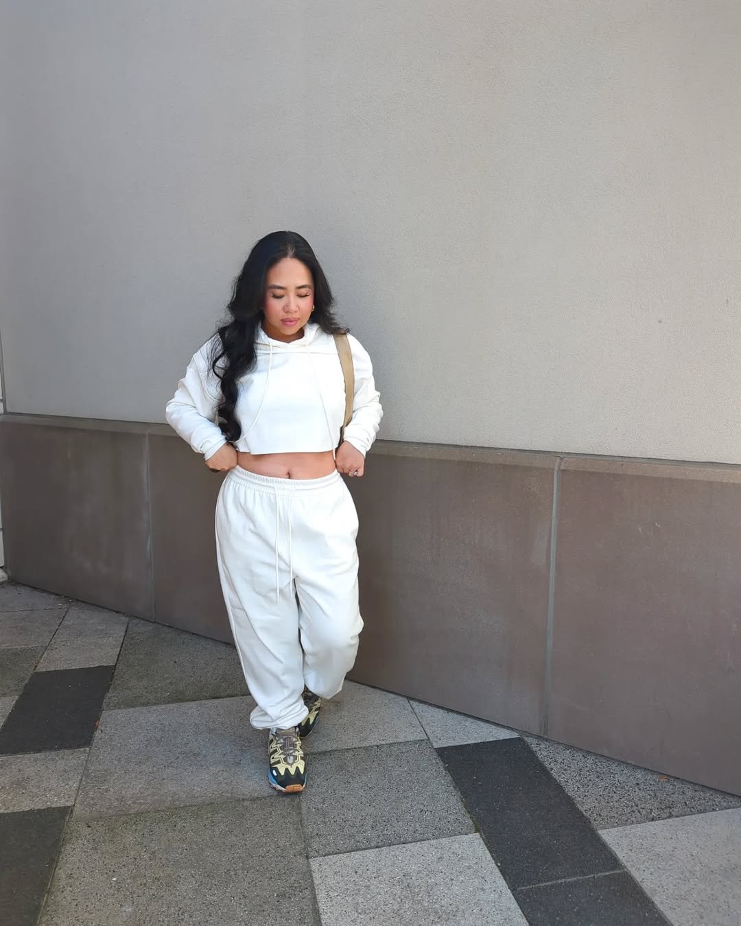 There is something about an all-white sweats look that instantly feels crisp. The cropped hoodie paired with relaxed sweatpants creates a silhouette that feels sporty but still polished, like the outfit version of a fresh start kind of morning.