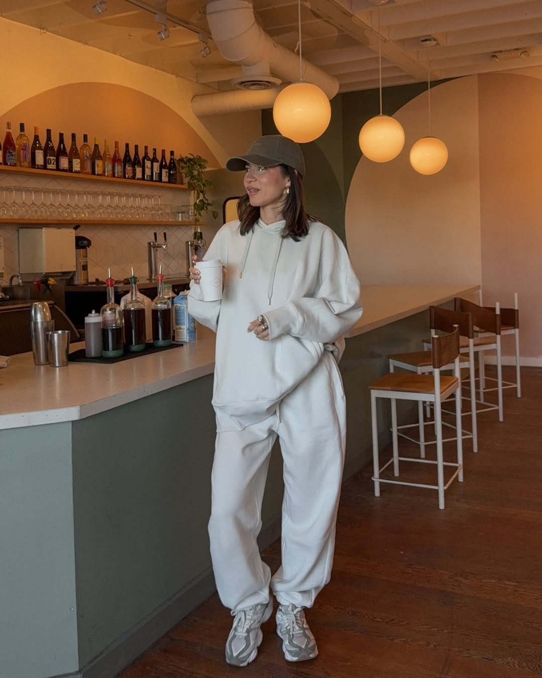 Some outfits just belong in a cozy café setting. The soft cream sweatsuit paired with a baseball cap and sneakers feels relaxed and unfussy, exactly the kind of look that works for a slow coffee date.