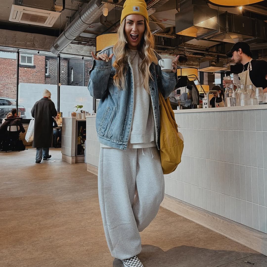 There is something about a grey sweatsuit that always feels like a comfort classic. The relaxed sweatpants and oversized sweatshirt give that cozy, lived-in feel, while the denim jacket layered on top keeps it from leaning too loungey.