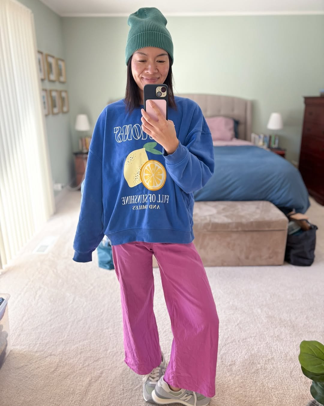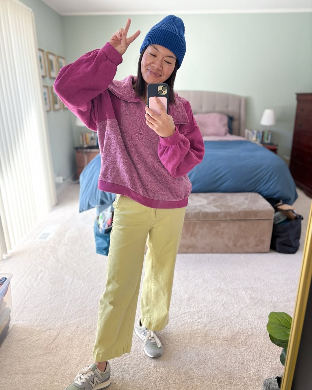 Proof that sweatpants do not have to be boring. The soft lime green pants paired with that cozy berry-toned fleece instantly brighten the whole look, and the blue beanie adds one more playful pop that somehow just works.
