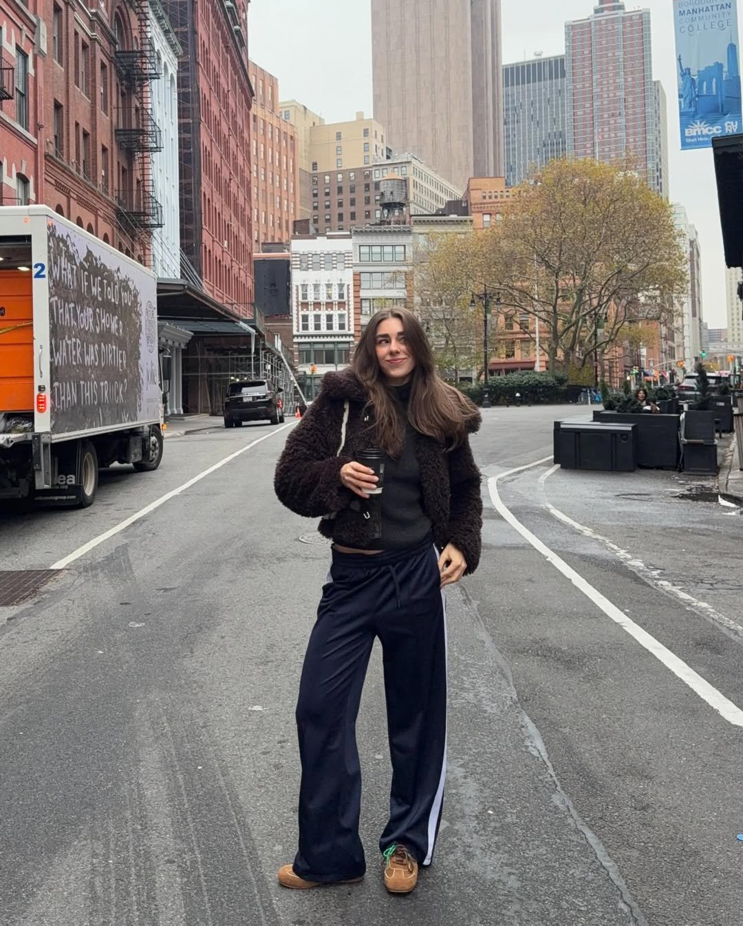This outfit captures that cozy, urban energy perfectly. A textured brown jacket layered over a simple top pairs beautifully with relaxed navy sweatpants that flow with every step.