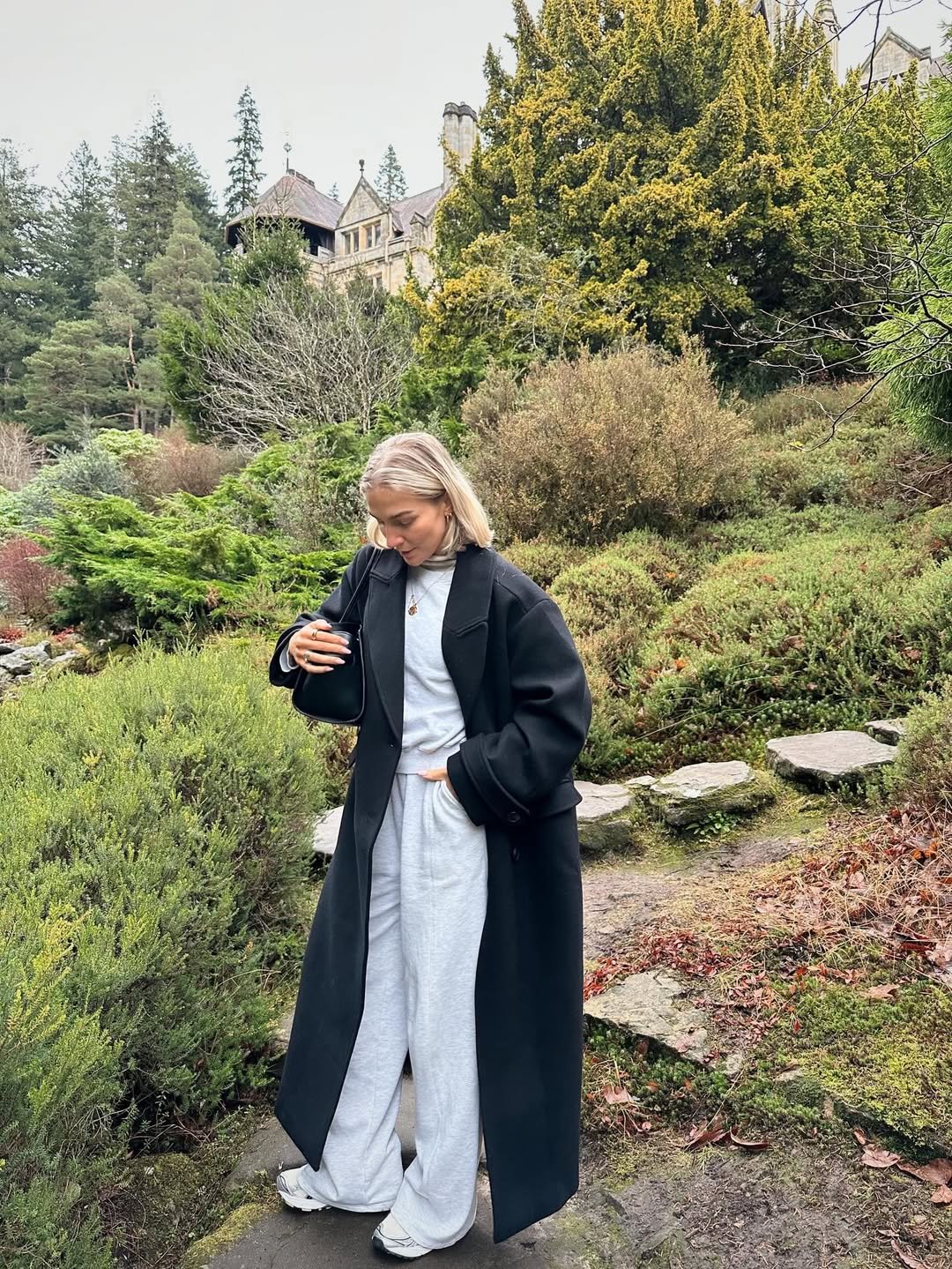 Sometimes all a simple sweatpant look needs is a great coat. The soft grey set feels minimal and relaxed, but the long structured black coat instantly elevates everything.