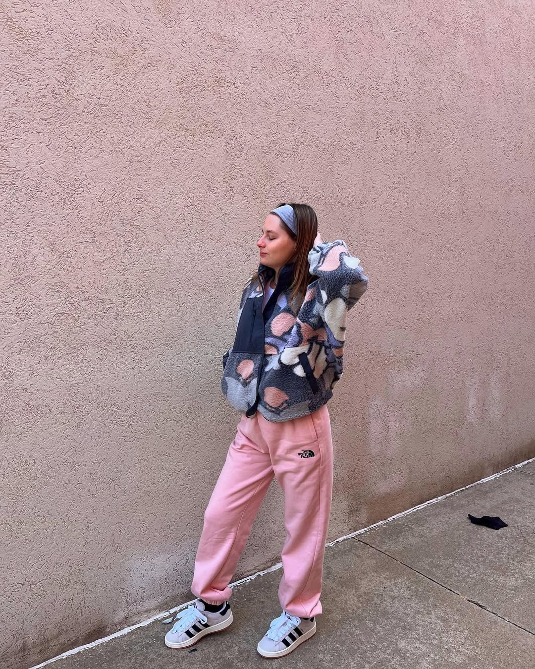 Pink sweatpants already bring a cheerful vibe, but pairing them with a textured fleece jacket adds a cozy dimension that makes the outfit feel extra fun. It’s relaxed, playful, and completely unbothered.
