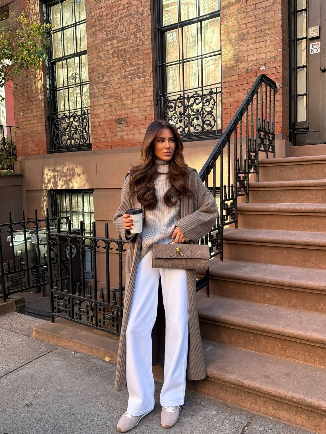 This look proves sweatpants can absolutely feel polished. The soft white pants paired with a chunky knit sweater and long cardigan create a layered outfit that feels calm and refined.