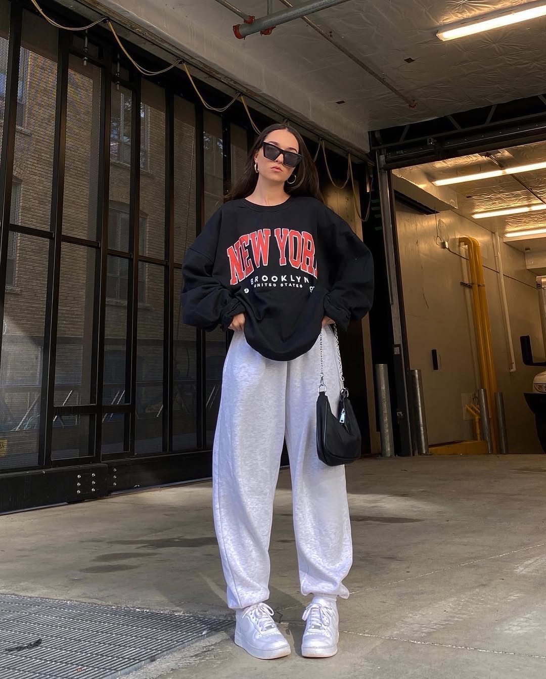 Oversized graphic sweatshirts will never go out of style, especially when they carry that classic New York lettering. Paired with relaxed grey sweatpants, the look leans fully into that effortless streetwear aesthetic.