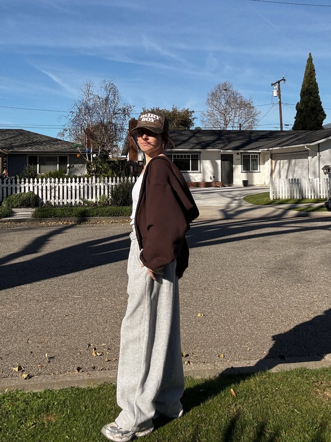 This outfit feels like a slow Sunday afternoon in the best way. The oversized sweatshirt and wide-leg sweatpants create that relaxed, slouchy silhouette that instantly signals comfort.