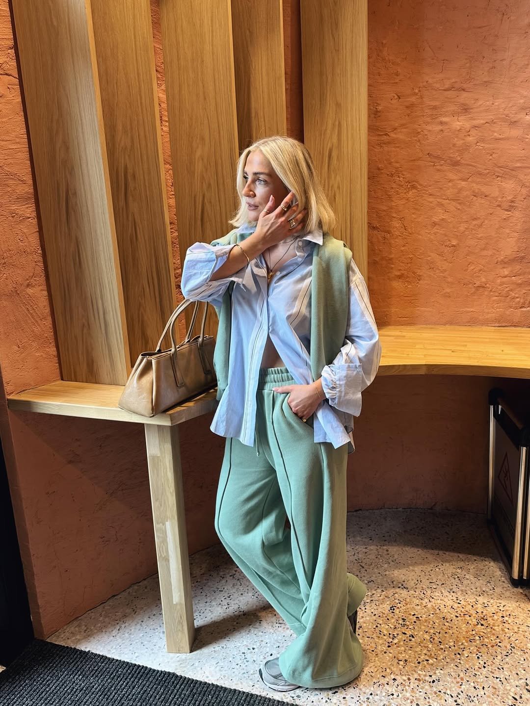 This outfit quietly blends comfort and polish in the best way. The sage green lounge pants paired with a crisp button-down shirt create a relaxed silhouette that still feels put together.